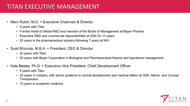 TITAN PRONEURA PRODUCT PIPELINE 20 CANDIDATE INDICATION DEVELOPMENT STAGE Probuphine ® Opioid Addiction Ropinirole Implant Parkinson’s Disease T3 Implant Hypothyroidism PRECLINICAL PHASE 1 PHASE 2 PHASE 3 MARKET PRECLINICAL PHASE 1 PHASE 2 PHASE 3 MARKET PRECLINICAL PHASE 1 PHASE 2 PHASE 3 MARKET