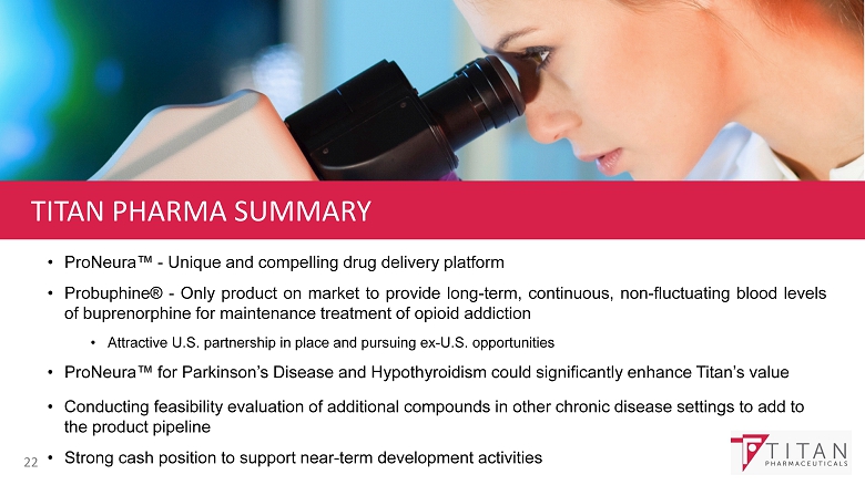 TITAN EXECUTIVE MANAGEMENT 21 • Marc Rubin, M . D . Executive Chairman & Director • 9 years with Titan • Former Head of Global R&D and member of the Board of Management at Bayer Pharma • Executive R&D and commercial responsibilities at GSK for 13 years • 25 years in the pharmaceutical industry following 7 years at NIH • Sunil Bhonsle, M . B . A . President, CEO & Director • 20 years with Titan • 20 years with Bayer Corporation in Biological and Pharmaceutical finance and operations management • Kate Beebe, Ph . D . Executive Vice President, Chief Development Officer • 9 years with Titan • 20 years in industry, with senior positions in clinical development and medical affairs at GSK, Merck, and Corcept Therapeutics • 10 years in academic medicine