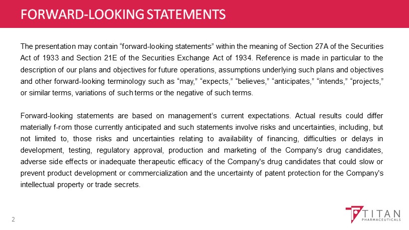 TITAN PHARMACEUTICALS CORPORATE PRESENTATION SUNIL BHONSLE NOVEMBER 2016 © 2016 TITAN PHARMACEUTICALS INC. NASDAQ:TTNP