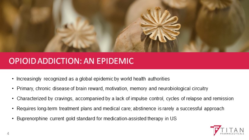 COMPANY SNAPSHOT 3 • Focus on proprietary therapeutics for select chronic diseases • ProNeura TM drug delivery platform provides long - term, continuous, non - fluctuating medication levels • Probuphine® (buprenorphine) implant – six - month maintenance treatment of opioid addiction • FDA approval May 2016 • Large and growing market opportunity; significant unmet medical need • Product pipeline: Ropinirole implant for Parkinson’s disease and T3 implant for Hypothyroidism • Strong Cash Position to Support Near - term Development Activities