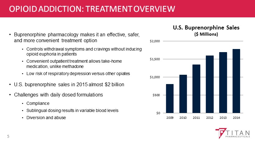 OPIOID ADDICTION: AN EPIDEMIC • Increasingly recognized as a global epidemic by world health authorities • Primary, chronic disease of brain reward, motivation, memory and neurobiological circuitry • Characterized by cravings, accompanied by a lack of impulse control, cycles of relapse and remission • Requires long - term treatment plans and medical care; abstinence is rarely a successful approach • Buprenorphine current gold standard for medication - assisted therapy in US 4