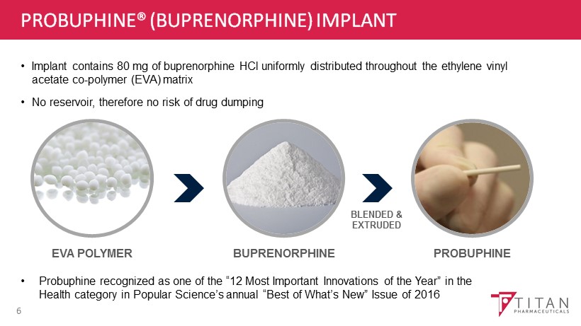 OPIOID ADDICTION: TREATMENT OVERVIEW 5 • Buprenorphine pharmacology makes it an effective, safer, and more convenient treatment option • Controls withdrawal symptoms and cravings without inducing opioid euphoria in patients • Convenient outpatient treatment allows take - home medication, unlike methadone • Low risk of respiratory depression versus other opiates • U.S . buprenorphine sales in 2015 almost $ 2 billion • Challenges with daily dosed formulations • Compliance • Sublingual dosing results in variable blood levels • Diversion and abuse $0 $500 $1,000 $1,500 $2,000 2009 2010 2011 2012 2013 2014 U.S. Buprenorphine Sales ($ Millions)