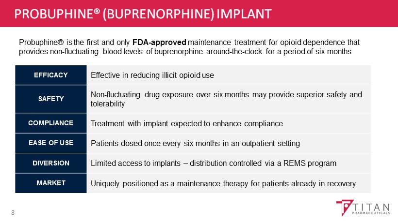 PROBUPHINE® ADMINISTRATION 7 • Inserted subdermally in the inner side of the upper arm by a certified health care provider • Drug is released continuously into patient's body through the process of dissolution • Results in a stable level of medication in the blood, avoiding peaks and troughs of oral dosing
