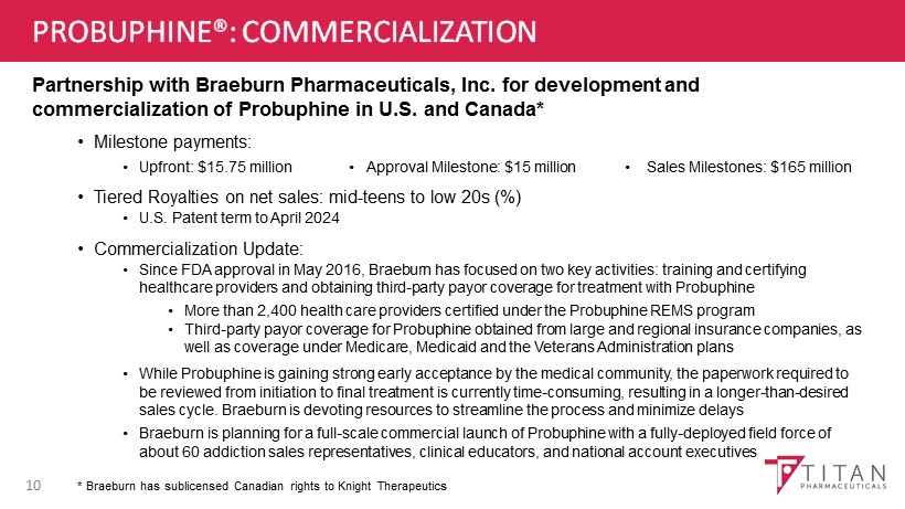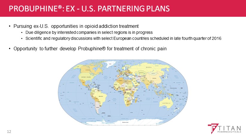 TITAN PHARMA SUMMARY • ProNeura ™ - Unique and compelling long - term drug delivery platform • Probuphine ® - Only product on market to provide six month, continuous, non - fluctuating blood levels of buprenorphine for maintenance treatment of opioid addiction • Attractive U . S . partnership in place and pursuing ex - U . S . opportunities • ProNeura ™ implants for Parkinson’s Disease and Hypothyroidism could significantly enhance Titan’s value • Product pipeline: Conducting feasibility evaluation of additional compounds in other chronic disease settings • September 30, 2016: Strong cash position of $16.5 million funds activities into early 2018 • November 4, 2016: Common shares outstanding 21.2 million (25.1 million fully diluted) 21