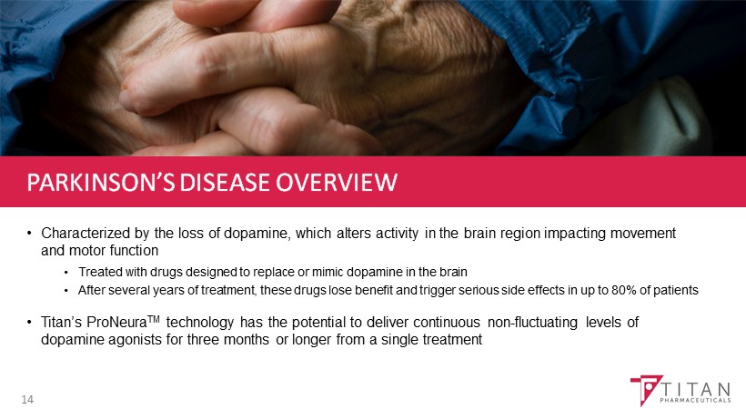 PRONEURA: ADDING VALUE BEYOND PROBUPHINE® 13 • Long - term drug delivery technology validated through the Probuphine® program • Potential for the treatment of select chronic diseases for which low dose, long - term delivery and stable drug levels may offer advantages over other forms of administration • Product development programs in progress: • Ropinirole implant for the treatment of Parkinson’s disease (PD) • Triiodothyronine (T3) implant for the treatment of hypothyroidism • Conducting feasibility evaluation of additional compounds in other chronic disease settings to add to the product pipeline • Goal is to pursue commercial partnerships for product candidates at appropriate stages of development, and potential licensing agreements with other pharmaceutical companies for ProNeura - based technology