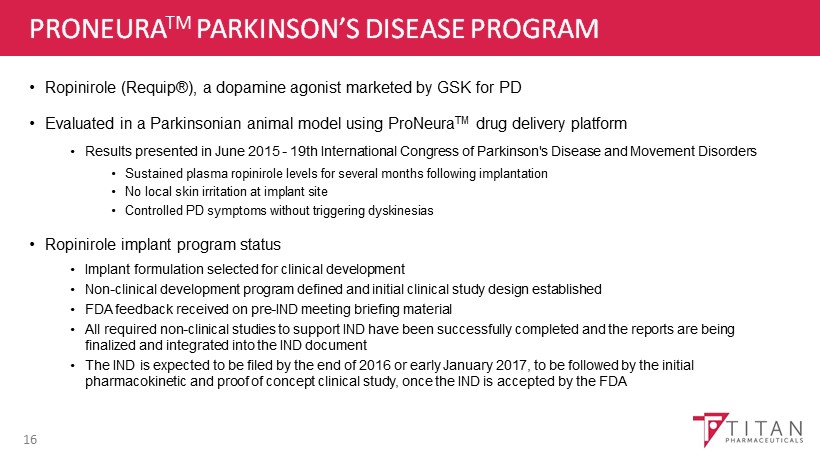 PARKINSON’S DISEASE – THERAPEUTICS MARKET 15 * GlobalData; **Parkinson’s Action Network, National Center for Health Statistics; “The Current and Projected Economic Burden of Parkinson’s Disease in the United States” Movement Disorders, March 2013 Based on information from Titan and other sources believed to be reliable and prepared exclusively for Titan. Woodside Capita l P artners is not responsible for any use that Titan may make of this material. Sales of Dopamine Agonists, U.S.* Year Total Sales % DA $ DA 2012 $1.1 Billion 26% $286 Million 2022 $2.3 Billion 18% $414 Million Cost to American Society ** $14.4 Billion Annually Treatment Costs $8.1 Billion Indirect Costs $6.3 Billion If costs continue to rise they will double by 2040 • As many as 1 million people in the US affected • That number is expected to almost double by 2030 due to aging of population • About 60 , 000 newly diagnosed for PD annually • More than 23 , 000 die from PD each year