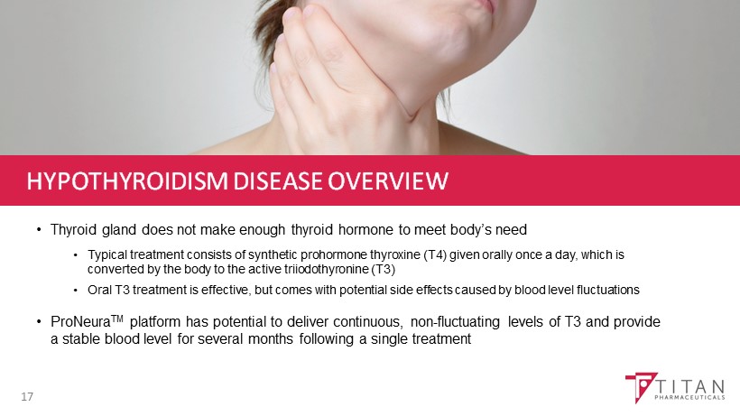 HYPOTHYROIDISM DISEASE OVERVIEW • Thyroid gland does not make enough thyroid hormone to meet body’s need • Typical treatment consists of synthetic prohormone thyroxine (T4) given orally once a day, which is converted by the body to the active triiodothyronine (T3) • Oral T3 treatment is effective, but comes with potential side effects caused by blood level fluctuations • ProNeura TM platform has potential to deliver continuous, non - fluctuating levels of T3 and provide a stable blood level for several months following a single treatment 17