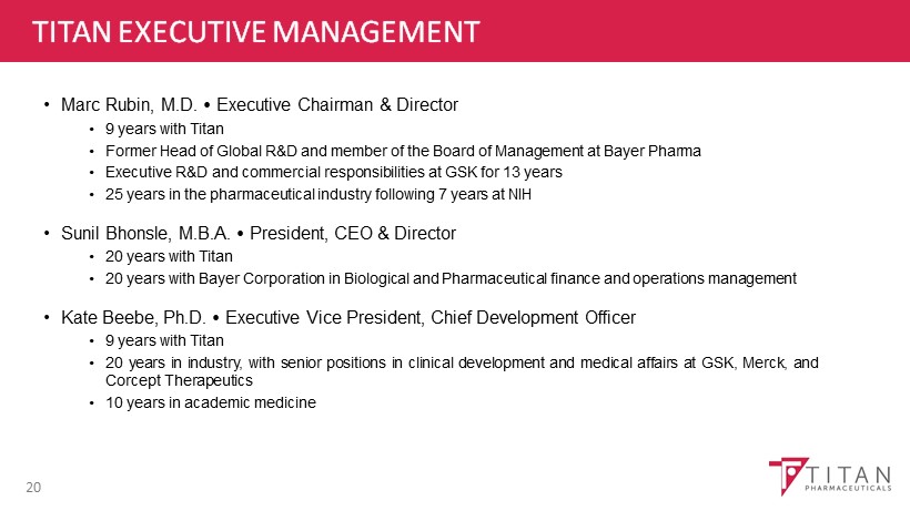 TITAN EXECUTIVE MANAGEMENT 20 • Marc Rubin, M . D . Executive Chairman & Director • 9 years with Titan • Former Head of Global R&D and member of the Board of Management at Bayer Pharma • Executive R&D and commercial responsibilities at GSK for 13 years • 25 years in the pharmaceutical industry following 7 years at NIH • Sunil Bhonsle, M . B . A . President, CEO & Director • 20 years with Titan • 20 years with Bayer Corporation in Biological and Pharmaceutical finance and operations management • Kate Beebe, Ph . D . Executive Vice President, Chief Development Officer • 9 years with Titan • 20 years in industry, with senior positions in clinical development and medical affairs at GSK, Merck, and Corcept Therapeutics • 10 years in academic medicine