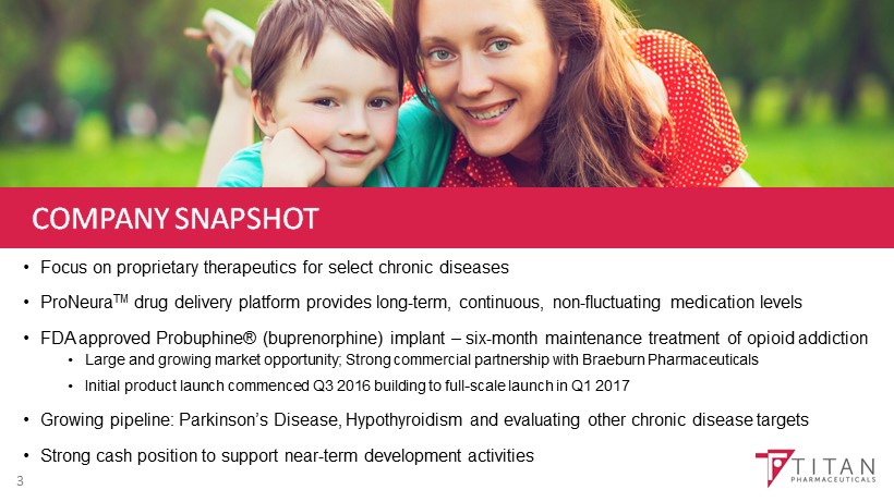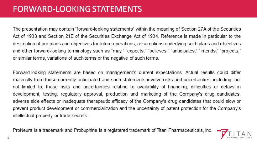FORWARD - LOOKING STATEMENTS The presentation may contain “forward - looking statements” within the meaning of Section 27 A of the Securities Act of 1933 and Section 21 E of the Securities Exchange Act of 1934 . Reference is made in particular to the description of our plans and objectives for future operations, assumptions underlying such plans and objectives and other forward - looking terminology such as “may,” “expects,” “believes,” “anticipates,” “intends,” “projects,” or similar terms, variations of such terms or the negative of such terms . Forward - looking statements are based on management’s current expectations . Actual results could differ materially from those currently anticipated and such statements involve risks and uncertainties, including, but not limited to, those risks and uncertainties relating to availability of financing, difficulties or delays in development, testing, regulatory approval, production and marketing of the Company's drug candidates, adverse side effects or inadequate therapeutic efficacy of the Company's drug candidates that could slow or prevent product development or commercialization and the uncertainty of patent protection for the Company's intellectual property or trade secrets . ProNeura is a trademark and Probuphine is a registered trademark of Titan Pharmaceuticals, Inc . 2