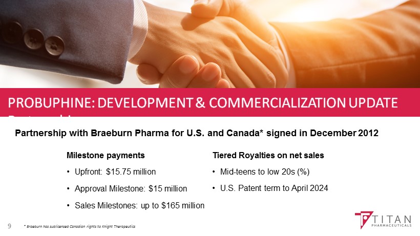 OPIOID ADDICTION: OPPORTUNITY FOR PROBUPHINE 8 • Major epidemic in the U.S. with an estimated 2.5 million people affected with this disease • Buprenorphine treatment is the gold standard as an effective, safer, and more convenient treatment option with U.S. sales in 2015 of almost $2 billion • Controls withdrawal symptoms and cravings without inducing opioid euphoria in patients • Convenient outpatient treatment allows take - home medication, unlike methadone • Low risk of respiratory depression versus other opiates • BUT, major challenges with daily dosed formulations persist • Compliance ; V ariable blood levels; Diversion & Abuse • Probuphine addresses all of these challenges and provides a unique treatment option $0 $500 $1,000 $1,500 $2,000 2009 2010 2011 2012 2013 2014 U.S. Buprenorphine Sales ($ Millions)