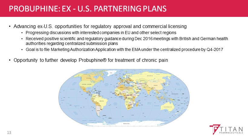TITAN PHARMACEUTICALS SUMMARY • ProNeura - Unique and compelling long - term drug delivery platform • Probuphine - Only product on market to provide six - month, continuous, non - fluctuating blood levels of buprenorphine for maintenance treatment of opioid addiction • Attractive U . S . partnership in place and pursuing ex - U . S . opportunities • ProNeura implants for Parkinson’s Disease and Hypothyroidism could significantly enhance Titan’s value • Also evaluating additional compounds in other chronic disease settings • At September 30, 2016: Strong cash position of $16.5 million funds activities into early 2018 • At September 30 , 2016: Common shares outstanding 21.2 million (25.1 million fully diluted) 21