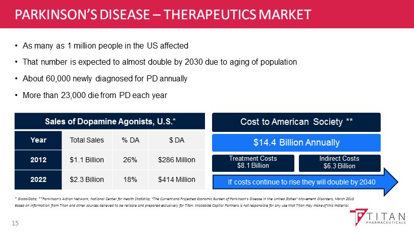 PARKINSON’S DISEASE OVERVIEW • Characterized by the loss of dopamine, which alters activity in the brain region impacting movement and motor function • Treated with drugs designed to replace or mimic dopamine in the brain • After several years of treatment , these drugs lose benefit and trigger serious side effects in up to 80% of patients • Titan’s ProNeura technology has the potential to deliver continuous non - fluctuating levels of dopamine agonists for three months or longer from a single treatment 14