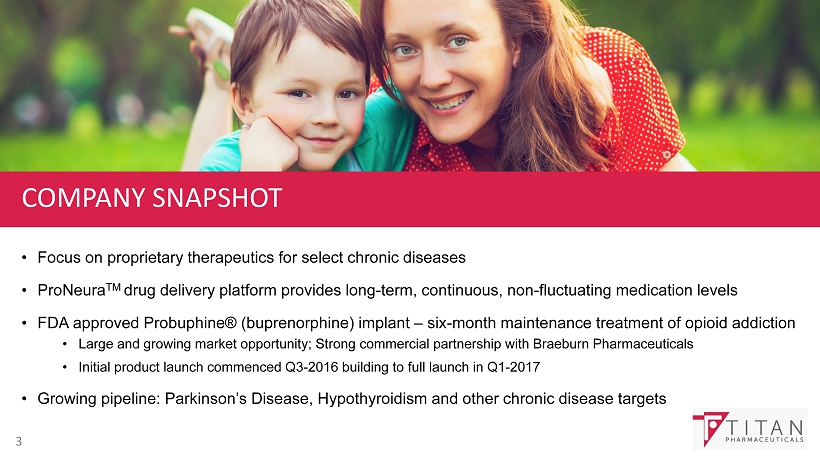 FORWARD - LOOKING STATEMENTS The presentation may contain “forward - looking statements” within the meaning of Section 27 A of the Securities Act of 1933 and Section 21 E of the Securities Exchange Act of 1934 . Reference is made in particular to the description of our plans and objectives for future operations, assumptions underlying such plans and objectives and other forward - looking terminology such as “may,” “expects,” “believes,” “anticipates,” “intends,” “projects,” or similar terms, variations of such terms or the negative of such terms . Forward - looking statements are based on management’s current expectations . Actual results could differ materially from those currently anticipated and such statements involve risks and uncertainties, including, but not limited to, those risks and uncertainties relating to availability of financing, difficulties or delays in development, testing, regulatory approval, production and marketing of the Company's drug candidates, adverse side effects or inadequate therapeutic efficacy of the Company's drug candidates that could slow or prevent product development or commercialization and the uncertainty of patent protection for the Company's intellectual property or trade secrets . ProNeura is a trademark and Probuphine is a registered trademark of Titan Pharmaceuticals, Inc . 2