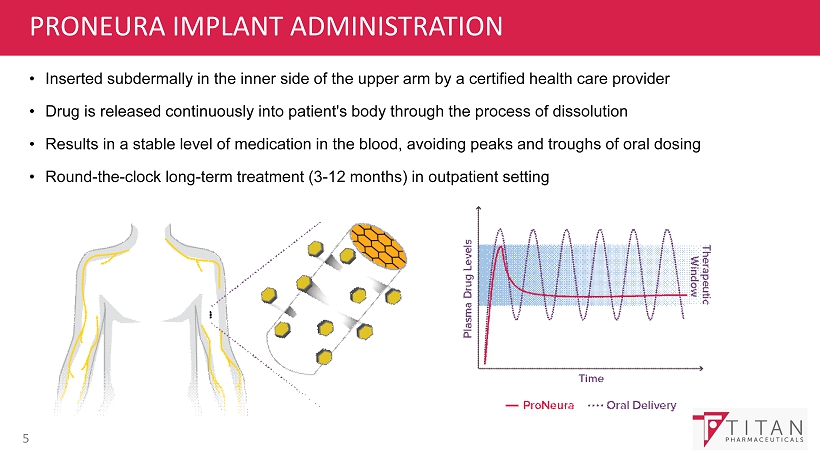 PRONEURA: LONG - TERM DRUG DELIVERY PLATFORM 4 • Active pharmaceutical ingredient (API) uniformly distributed throughout the ethylene vinyl acetate co - polymer (EVA) matrix • No reservoir, therefore no risk of drug dumping • Controlled rate of drug delivery and virtually 100% bioavailability EVA POLYMER API IMPLANT BLENDED & EXTRUDED +