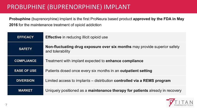 TITAN PRONEURA PRODUCT PIPELINE 6 CANDIDATE INDICATION DEVELOPMENT STAGE Probuphine ® (United States) Opioid Addiction Probuphine ® (European Union) Opioid Addiction Ropinirole Implant Parkinson’s Disease T3 Implant Hypothyroidism Feasibility evaluation of additional compounds in other chronic disease settings in progress PRECLINICAL PHASE 1 PHASE 2 PHASE 3 MARKET PRECLINICAL PHASE 1 PHASE 2 PHASE 3 MARKET PRECLINICAL PHASE 1 PHASE 2 PHASE 3 MARKET PRECLINICAL PHASE 1 PHASE 2 PHASE 3 MARKET