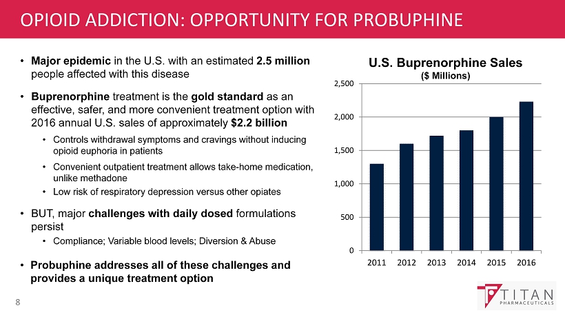 PROBUPHINE (BUPRENORPHINE) IMPLANT 7 Probuphine (buprenorphine) implant is the first ProNeura based product approved by the FDA in M ay 2016 for the maintenance treatment of opioid addiction EFFICACY Effective in reducing illicit opioid use SAFETY Non - fluctuating drug exposure over six months may provide superior safety and tolerability COMPLIANCE Treatment with implant expected to enhance compliance EASE OF USE Patients dosed once every six months in an outpatient setting DIVERSION Limited access to implants – distribution controlled via a REMS program MARKET Uniquely positioned as a maintenance therapy for patients already in recovery