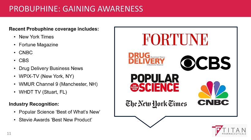 PROBUPHINE: U.S. COMMERCIALIZATION UPDATE* 10 • More than 2,500 health care providers certified under the Probuphine REMS program • Over 70 payors signaled intention to cover Probuphine, including Medicare, Medicaid & VA programs • Braeburn has devoted additional resources to streamlining the paperwork and improving Probuphine order processing, including expanding specialty pharmacy coverage • In Q1 - 2017 Braeburn commenced a full commercial launch of Probuphine with a field sales force and medical support staff of more than 60, focusing on more than 80 key treatment centers throughout the U.S. * Source: Braeburn Pharmaceuticals, Inc. Form S - 1 filed with U.S. Securities and Exchange Commission on December 30, 2016
