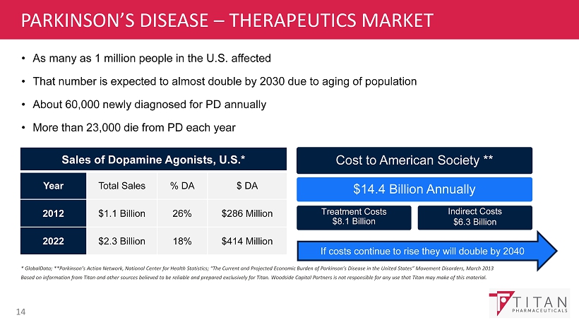 PARKINSON’S DISEASE OVERVIEW • Characterized by the loss of dopamine, which alters activity in the brain region impacting movement and motor function • Treated with drugs designed to replace or mimic dopamine in the brain • After several years of treatment , these drugs lose benefit and trigger serious side effects in up to 80% of patients • Titan’s ProNeura technology has the potential to deliver continuous non - fluctuating levels of dopamine agonists for three months or longer from a single treatment 13