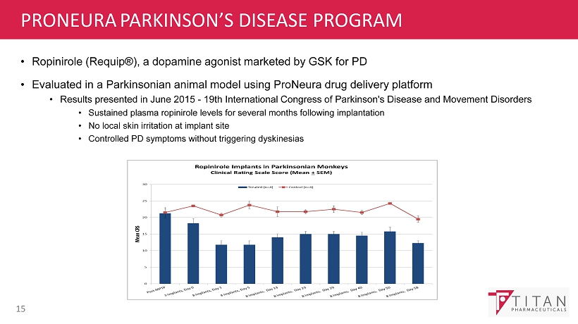 PARKINSON’S DISEASE – THERAPEUTICS MARKET 14 * GlobalData; **Parkinson’s Action Network, National Center for Health Statistics; “The Current and Projected Economic Burden of Parkinson’s Disease in the United States” Movement Disorders, March 2013 Based on information from Titan and other sources believed to be reliable and prepared exclusively for Titan. Woodside Capita l P artners is not responsible for any use that Titan may make of this material. Sales of Dopamine Agonists, U.S.* Year Total Sales % DA $ DA 2012 $1.1 Billion 26% $286 Million 2022 $2.3 Billion 18% $414 Million Cost to American Society ** $14.4 Billion Annually Treatment Costs $8.1 Billion Indirect Costs $6.3 Billion If costs continue to rise they will double by 2040 • As many as 1 million people in the U . S . affected • That number is expected to almost double by 2030 due to aging of population • About 60 , 000 newly diagnosed for PD annually • More than 23 , 000 die from PD each year