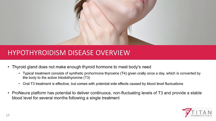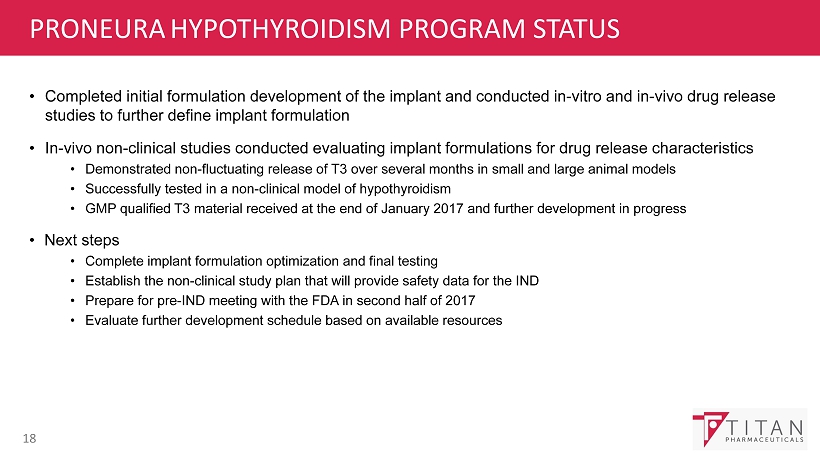 HYPOTHYROIDISM DISEASE OVERVIEW • Thyroid gland does not make enough thyroid hormone to meet body’s need • Typical treatment consists of synthetic prohormone thyroxine (T4) given orally once a day, which is converted by the body to the active triiodothyronine (T3) • Oral T3 treatment is effective, but comes with potential side effects caused by blood level fluctuations • ProNeura platform has potential to deliver continuous, non - fluctuating levels of T3 and provide a stable blood level for several months following a single treatment 17