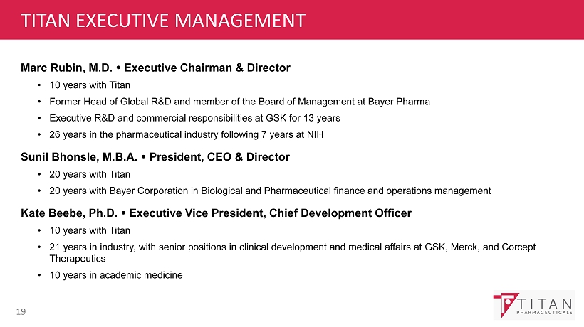 TITAN EXECUTIVE MANAGEMENT 19 Marc Rubin, M . D . Executive Chairman & Director • 10 years with Titan • Former Head of Global R&D and member of the Board of Management at Bayer Pharma • Executive R&D and commercial responsibilities at GSK for 13 years • 26 years in the pharmaceutical industry following 7 years at NIH Sunil Bhonsle, M . B . A . President, CEO & Director • 20 years with Titan • 20 years with Bayer Corporation in Biological and Pharmaceutical finance and operations management Kate Beebe, Ph . D . Executive Vice President, Chief Development Officer • 10 years with Titan • 21 years in industry, with senior positions in clinical development and medical affairs at GSK, Merck, and Corcept Therapeutics • 10 years in academic medicine
