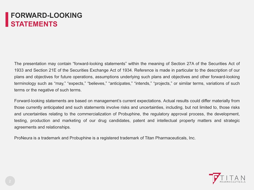 The presentation may contain “forward - looking statements” within the meaning of Section 27 A of the Securities Act of 1933 and Section 21 E of the Securities Exchange Act of 1934 . Reference is made in particular to the description of our plans and objectives for future operations, assumptions underlying such plans and objectives and other forward - looking terminology such as “may,” “expects,” “believes,” “anticipates,” “intends,” “projects,” or similar terms, variations of such terms or the negative of such terms . Forward - looking statements are based on management’s current expectations . Actual results could differ materially from those currently anticipated and such statements involve risks and uncertainties, including, but not limited to, those risks and uncertainties relating to the commercialization of Probuphine, the regulatory approval process, the development, testing, production and marketing of our drug candidates, patent and intellectual property matters and strategic agreements and relationships . ProNeura is a trademark and Probuphine is a registered trademark of Titan Pharmaceuticals, Inc . 2 FORWARD - LOOKING STATEMENTS