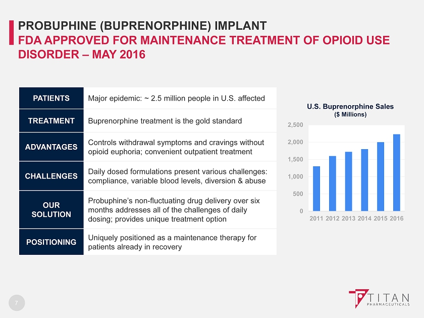 6 CANDIDATE INDICATION DEVELOPMENT STAGE Probuphine (United States) OUD Probuphine (European Union) OUD Ropinirole Implant Parkinson’s Disease T3 Implant Hypothyroidism PRECLINICAL PHASE 1 PHASE 2 PHASE 3 MARKET PRECLINICAL PHASE 1 PHASE 2 PHASE 3 MARKET PRECLINICAL PHASE 1 PHASE 2 PHASE 3 MARKET PRONEURA PRODUCT PIPELINE PRECLINICAL PHASE 1 PHASE 2 PHASE 3 MARKET CANDIDATE INDICATION DEVELOPMENT STAGE COLLABORATOR Opioid Antagonist OUD Feasibility evaluation Opiant Pharmaceuticals Kappa Opioid Agonist Chronic pain Feasibility evaluation JT Pharmaceuticals Antimalarial Drugs Malaria prophylaxis Feasibility evaluation WRAIR and SWRI