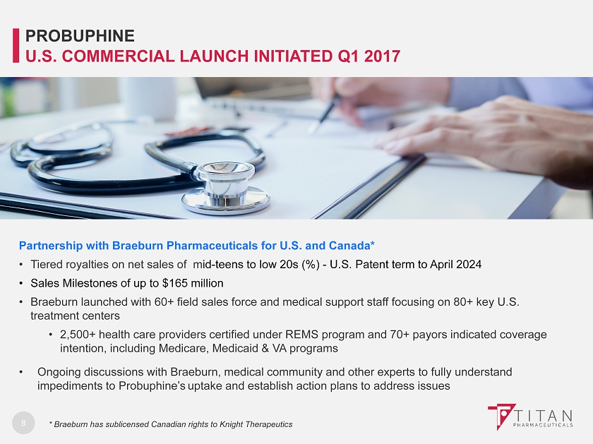 7 PATIENTS Major epidemic: ~ 2.5 million people in U.S. affected TREATMENT Buprenorphine treatment is the gold standard ADVANTAGES Controls withdrawal symptoms and cravings without opioid euphoria; convenient outpatient treatment CHALLENGES Daily dosed formulations present various challenges: compliance, variable blood levels, diversion & abuse OUR SOLUTION Probuphine’s non - fluctuating drug delivery over six months a ddresses all of the challenges of daily dosing ; provides unique treatment option POSITIONING Uniquely positioned as a maintenance therapy for patients already in recovery 0 500 1,000 1,500 2,000 2,500 2011 2012 2013 2014 2015 2016 U.S. Buprenorphine Sales ($ Millions) PROBUPHINE (BUPRENORPHINE) IMPLANT FDA APPROVED FOR MAINTENANCE TREATMENT OF OPIOID USE DISORDER – MAY 2016