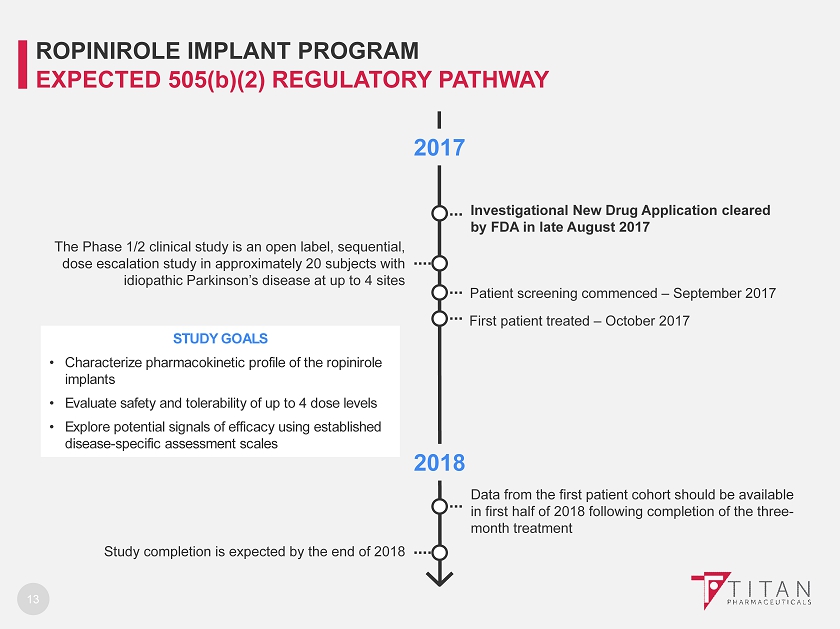 12 • Ropinirole (Requip ® ), a dopamine agonist marketed by GSK for PD • Evaluated in a Parkinsonian animal model using ProNeura drug delivery platform • Results presented in June 2015 - 19th International Congress of Parkinson's Disease and Movement Disorders • Sustained plasma ropinirole levels for several months following implantation • No local skin irritation at implant site • Controlled PD symptoms without triggering dyskinesias Lower CRS Score = Better Control of Parkinson Symptoms PRONEURA PARKINSON’S DISEASE PROGRAM