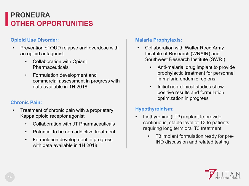 2018 2017 13 Investigational New Drug Application cleared by FDA in late August 2017 Study completion is expected by the end of 2018 Data from the first patient cohort should be available in first half of 2018 following completion of the three - month treatment STUDY GOALS • Characterize pharmacokinetic profile of the ropinirole implants • Evaluate safety and tolerability of up to 4 dose levels • Explore potential signals of efficacy using established disease - specific assessment scales The Phase 1/2 clinical study is an open label, sequential, dose escalation study in approximately 20 subjects with idiopathic Parkinson’s disease at up to 4 sites Patient screening commenced – September 2017 ROPINIROLE IMPLANT PROGRAM EXPECTED 505(b)(2) REGULATORY PATHWAY First patient treated – October 2017