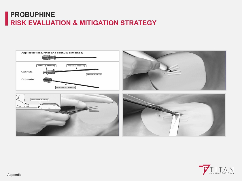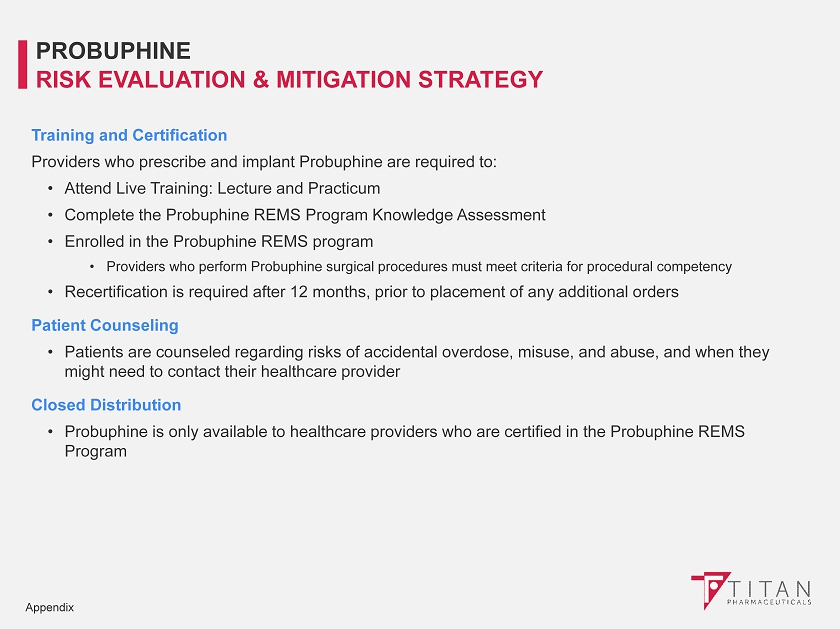 Training and Certification Providers who prescribe and implant Probuphine are required to: • Attend Live Training: Lecture and Practicum • Complete the Probuphine REMS Program Knowledge Assessment • E nrolled in the Probuphine REMS program • Providers who perform Probuphine surgical procedures must meet criteria for procedural competency • Recertification is required after 12 months, prior to placement of any additional orders Patient Counseling • Patients are counseled regarding risks of accidental overdose, misuse, and abuse, and when they might need to contact their healthcare provider Closed Distribution • Probuphine is only available to healthcare providers who are certified in the Probuphine REMS Program Appendix PROBUPHINE RISK EVALUATION & MITIGATION STRATEGY