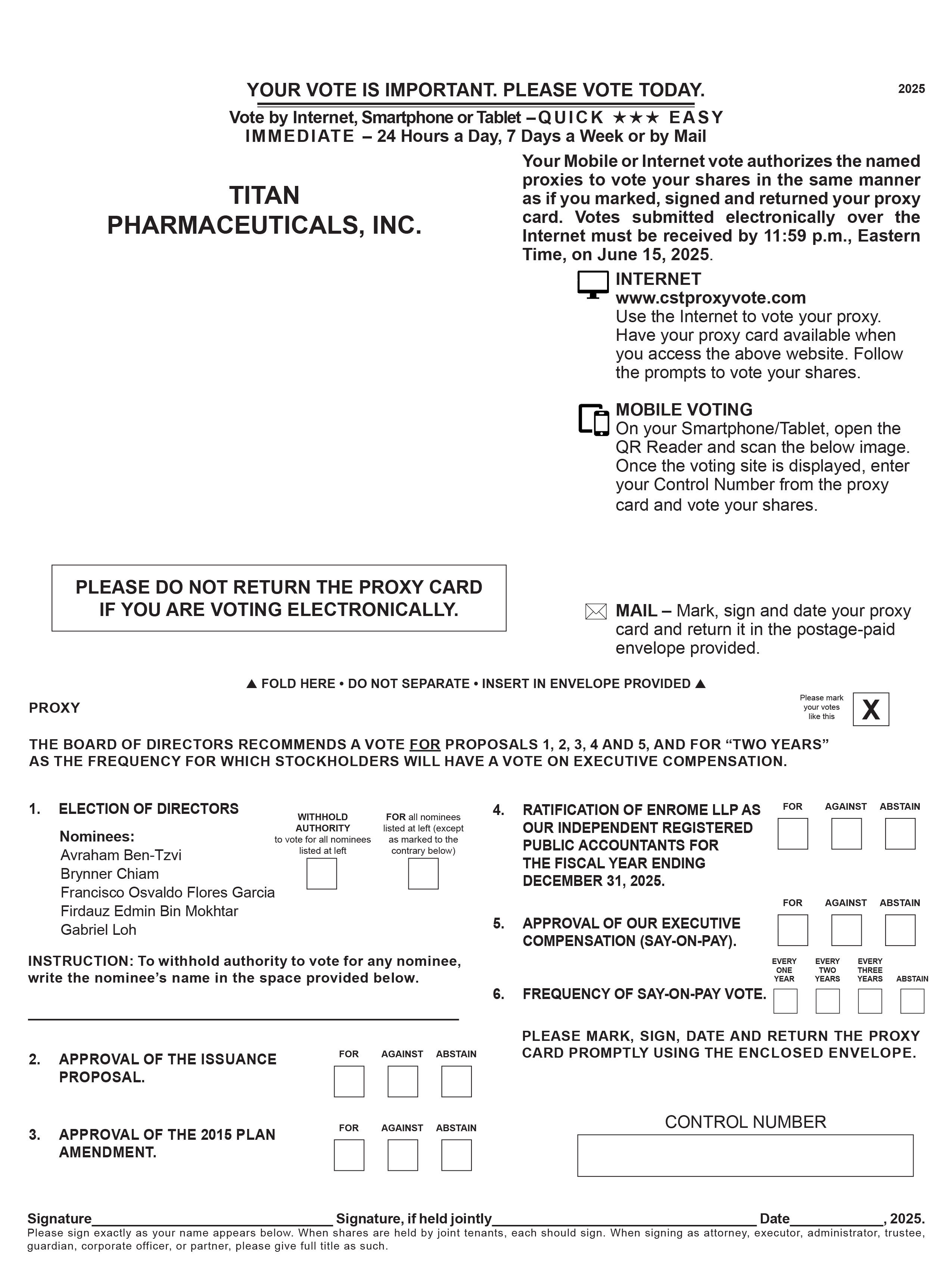 2025 TI T AN PHARMACEUTICALS, INC. Signature Signature, if held jointly Date , 2025. Pleas e sig n exactl y a s you r nam e appear s belo w . Whe n share s ar e hel d b y join t tenants , eac h shoul d sign . Whe n signin g a s attorne y , executo r, administrato r, trustee, guardian , corporat e o f fice r , o r partne r, pleas e giv e ful l titl e a s such. Please mark your votes lik e this X 19730 2 T ita n Pharma Proxy Car d Rev 3 Front CONTRO L NUMBER PROXY TH E BOAR D O F DIREC T OR S RECOMMEND S A VOT E FO R PROPOSAL S 1 , 2 , 3 , 4 AN D 5 , AN D FO R “ TW O YEAR S ” A S TH E FREQUENC Y FO R WHIC H S T OCKHOLDER S WIL L H A V E A VOT E O N EXECUTIV E COMPENS A TIO N . 4 . R A TIFIC A TION OF ENROME LLP AS OUR INDEPENDENT REGISTERED PUBLIC ACCOUN T ANT S FOR THE FISCAL YEAR ENDING DECEMBE R 31 , 2025. 5 . APPRO V A L OF OUR EXECUTIVE COMPENS A TION (S A Y - ON - P A Y). 6 . FREQUENCY OF S A Y - ON - P A Y VOTE. FOL D HER E • D O NO T SE P AR A T E • INSER T I N ENVELOP E PROVIDE D PLEAS E MARK , SIGN , D A T E AN D RETUR N TH E PROXY CAR D PROMPT L Y USIN G TH E ENCLOSE D ENVELOP E . a s if yo u marked , signe d an d returne d you r proxy card . V otes submitte d electronicall y over the Internet mus t be receive d by 1 1 : 5 9 p . m . , Eastern T ime, on Jun e 15 , 2025 . INTERNET ww w .cstproxyvote.com Us e the Internet to vote your prox y . Hav e your prox y card availabl e when you acces s the abov e website . Follow the prompt s to vote your shares. MOBILE VOTING On your Smartphone / T ablet , ope n the QR Reade r an d scan the belo w image. Once the voting site i s displayed , enter your Contro l Numbe r from the proxy card an d vote your shares. MAIL – Mark, sign an d dat e your proxy card an d return i t i n the postage - paid envelop e provided. ELECTION OF DIREC T ORS 1. APPRO V A L O F TH E 2015 PLAN AMENDMEN T . 3. V ot e b y Internet , Smartphon e o r T able t - QUIC K EAS Y IMMEDI A T E - 2 4 Hour s a Da y , 7 Day s a W ee k o r b y Mail Y our Mobile or Internet vot e authorize s the named proxies to vot e you r share s in the sam e manner Nominees: A vraham Ben - Tzvi Brynner Chiam Francisco Osvaldo Flores Garcia Firdauz Edmin Bin Mokhtar Gabriel Loh FOR al l nominees liste d a t lef t (except a s marked to the contrary below) WITHHOLD AUTHORITY to vote for al l nominees liste d a t left INSTRUCTION : T o withhol d authorit y t o vot e fo r an y nominee, writ e th e nominee ’ s nam e i n th e spac e provide d belo w . PLEASE D O NO T RETUR N THE PROXY CARD IF YOU AR E VOTING ELECTRONICAL L Y . YOUR VOTE IS IMPOR T AN T . PLEASE VOTE T OD A Y . FOR AGAINST ABS T AIN FOR AGAINST ABS T AIN FOR AGAINS T ABS T AIN FOR AGAINS T ABS T AIN EVE R Y ONE YEAR EVE R Y TWO YEARS EVE R Y THREE YEARS ABS T AIN APPRO V A L O F TH E ISSUANCE PROPOSA L . 2.