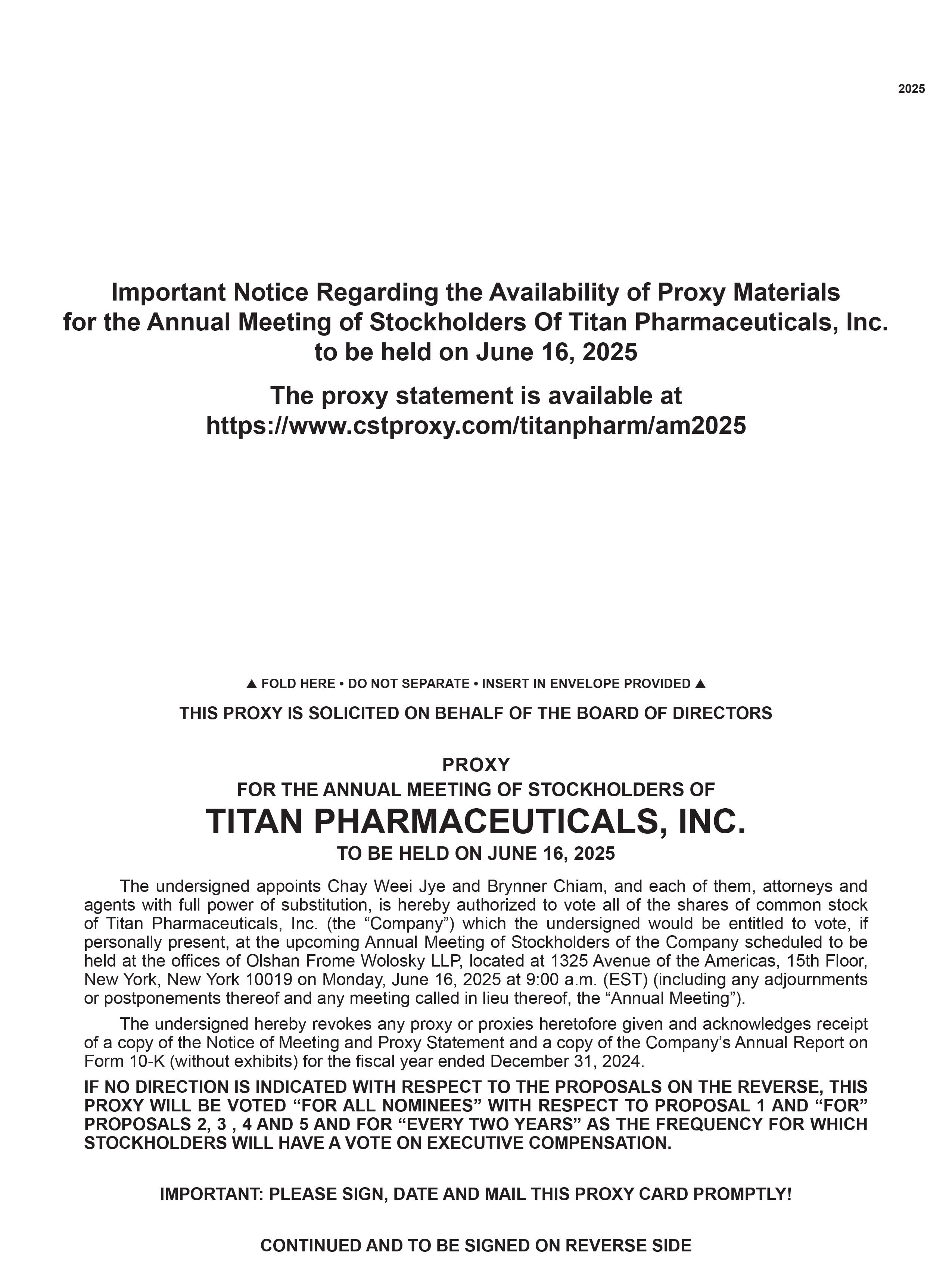2025 FOL D HER E • D O NO T SE P AR A T E • INSER T I N ENVELOP E PROVIDE D THIS PROXY IS SOLICITED ON BEHAL F OF THE BOAR D OF DIREC T ORS PROXY FOR THE ANNUA L MEETING OF S T OCKHOLDERS OF TI T A N PHARMACEUTICALS, INC. T O B E HEL D ON JUN E 16 , 2025 The undersigne d appoint s Cha y W ee i Jye an d Brynner Chiam , an d eac h o f them, attorney s and agent s wit h full powe r o f substitution, i s hereb y authorize d to vote al l o f the shares o f common stock o f T ita n Pharmaceuticals, Inc . (the “Company”) whic h the undersigne d woul d b e entitle d to vote, if personall y present , a t the upcomin g Annual Meeting o f Stockholders o f the Compan y scheduled to be held at the offices of Olshan Frome W olosky LL P , located at 1325 A venue of the Americas, 15 th Floo r , New Y ork, New Y ork 10019 on Monda y , June 16 , 2025 at 9 : 00 a . m . (EST) (including any adjournments o r postponement s thereof an d an y meeting called i n lie u thereof, the “Annual Meeting”) . The und ersigned hereb y revokes an y prox y o r proxie s heretofor e give n an d acknowledge s receipt o f a copy o f the Notic e o f Meeting an d Proxy Statement an d a copy o f the Company ’ s Annual Repor t on Form 10 - K (without exhibits) for the fiscal year ended December 31 , 2024 . IF N O DIRECTIO N IS INDIC A TED WITH RESPEC T T O THE PROPOSALS ON THE REVERSE , THIS PROXY WILL B E VOTED “FOR AL L NOMINEES ” WITH RESPEC T T O PROPOSAL 1 AN D “FOR” PROPOSALS 2 , 3 , 4 AN D 5 AN D FOR “EVE R Y TWO YEARS” A S THE FREQUENCY FOR WHICH S T OCKHOLDERS WILL H A VE A VOTE ON EXECUTIVE COMPENS A TION . IMPOR T AN T : PLEASE SIGN, D A TE AN D MAIL THIS PROXY CAR D PROMPT L Y! CONTINUE D AN D T O B E SIGNED ON REVERS E SIDE 19730 2 T ita n Pharma Proxy Car d Rev 3 Back Important Notic e Regardin g the A vailabilit y of Proxy Materials for the Annua l Meeting of Stockholders Of T itan Pharmaceuticals, Inc. to be held on Jun e 16 , 2025 The proxy statemen t is availabl e at https://ww w .cstprox y .com/titanpharm/am2025